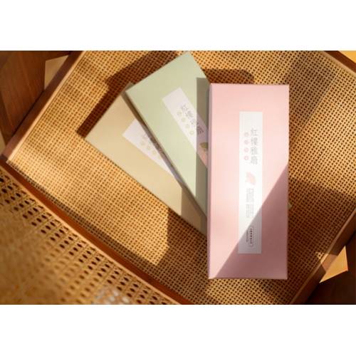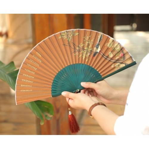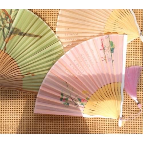 材質:扇面凌絹,扇骨頭青竹,扇套緞面,各有配色扇墜,十分精緻輕巧(每把扇本體只有
